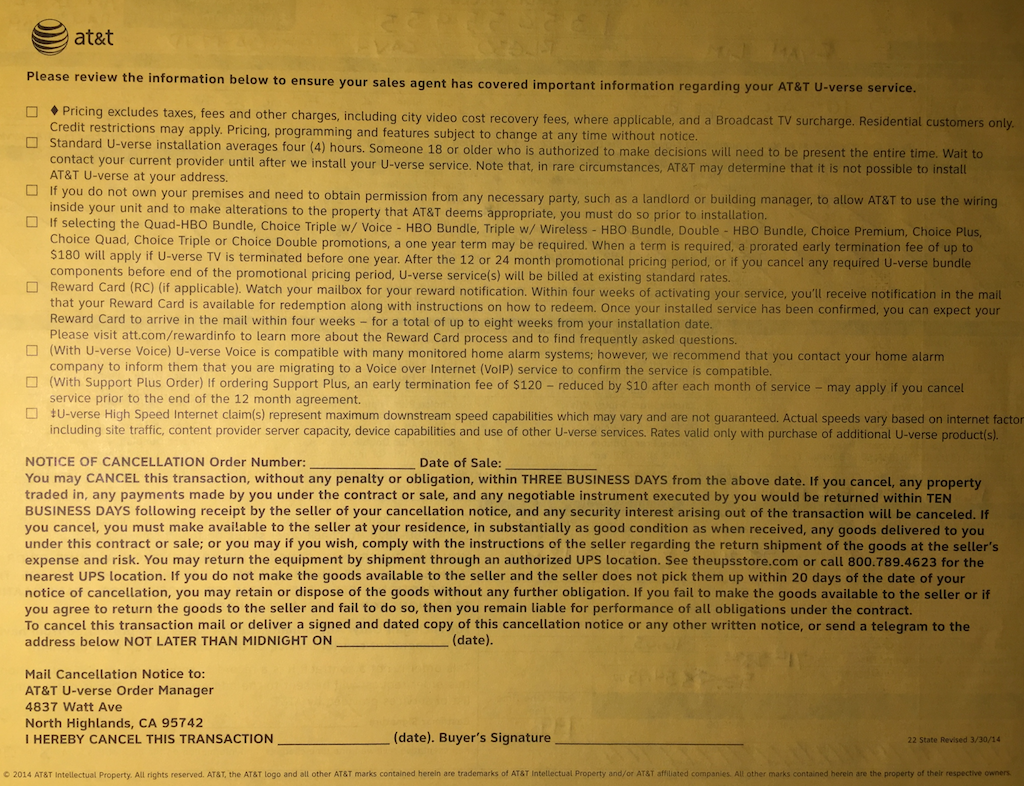Apparently ATT still stands for American Telephone and Telegraph company. This is the back of an actual ATT u-verse Internet service order form: